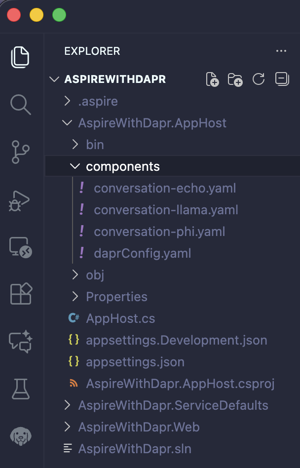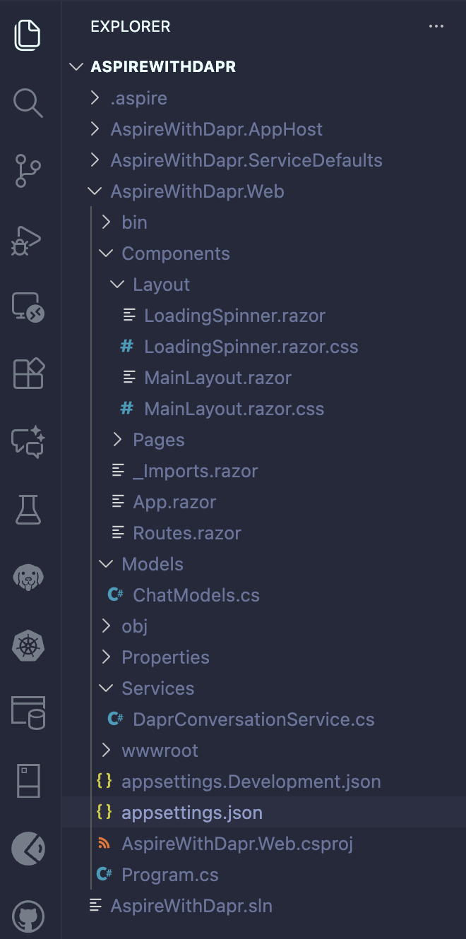 The demo application consists of three projects: AspireWithDapr.AppHost, AspireWithDapr.ServiceDefaults, and AspireWithDapr.Web. The AppHost and ServiceDefaults projects are part of Aspire, while AspireWithDapr.Web is a Blazor app used to send messages to LLMs through the Dapr Conversation API.