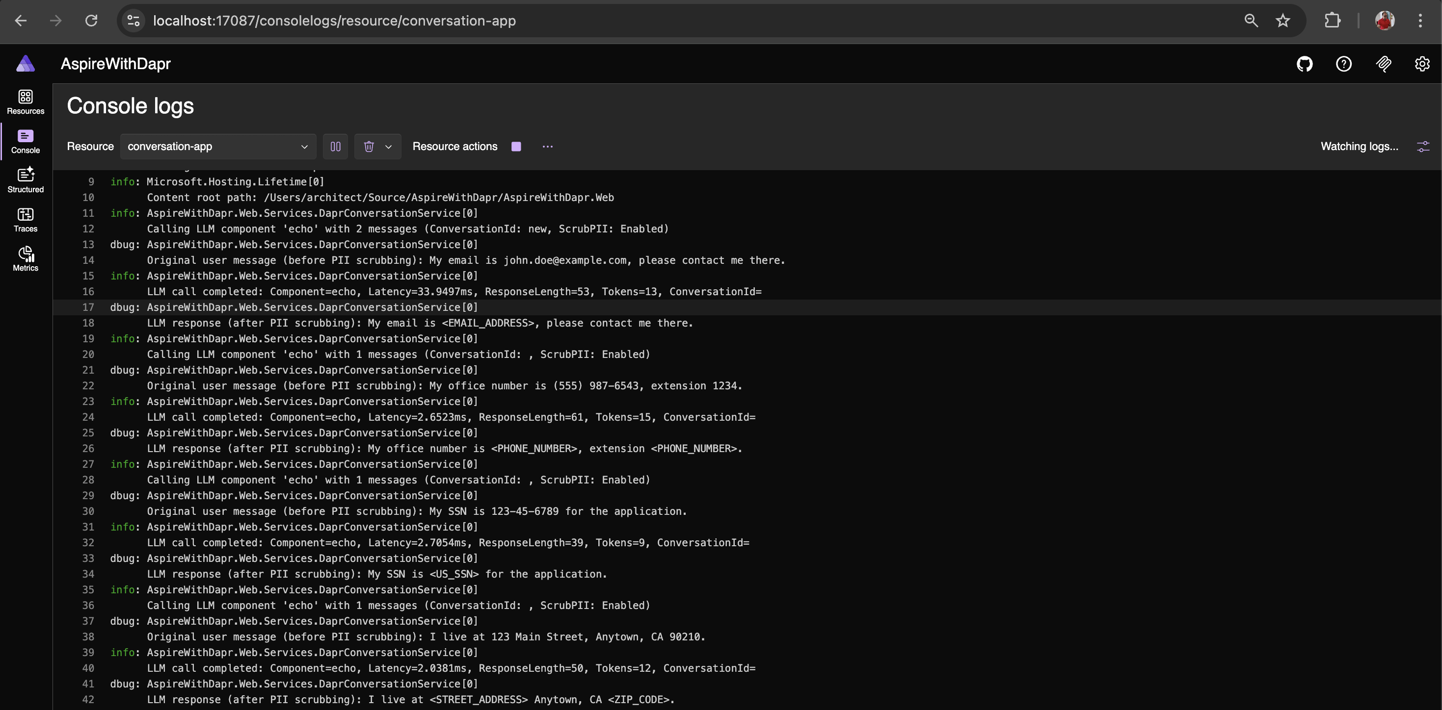 level=info msg="Component loaded: phi (conversation.ollama/v1)"Starting process... {"Executable": "/conversation-app-dapr-cli-raegdepg", "Reconciliation": 4, "Cmd": "/usr/local/bin/dapr", "Args": ["run", "--app-id", "conversation-app", "--config", "/Users/architect/Source/AspireWithDapr/AspireWithDapr.AppHost/components/daprConfig.yaml", "--resources-path", "/Users/architect/Source/AspireWithDapr/AspireWithDapr.AppHost/components", "--app-port", "5064", "--dapr-grpc-port", "52219", "--dapr-http-port", "52222", "--metrics-port", "52223", "--app-channel-address", "localhost", "--app-protocol", "http"]}Web App