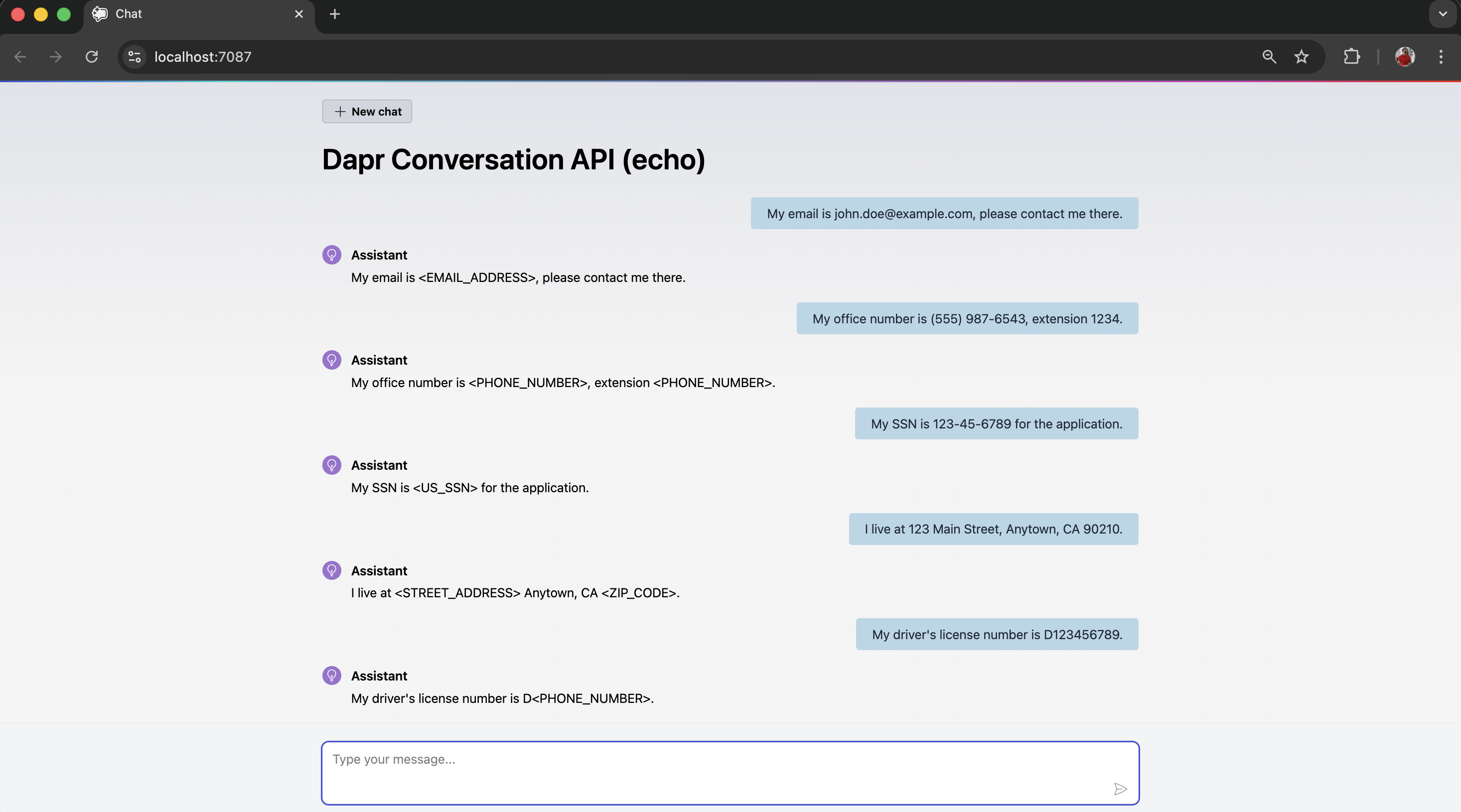You may begin testing with the Echo component and later switch to a real LLM. PII obfuscation does not function as expected with real LLMs. Since the Dapr Conversation API is currently in alpha, this limitation may be addressed in future updates.