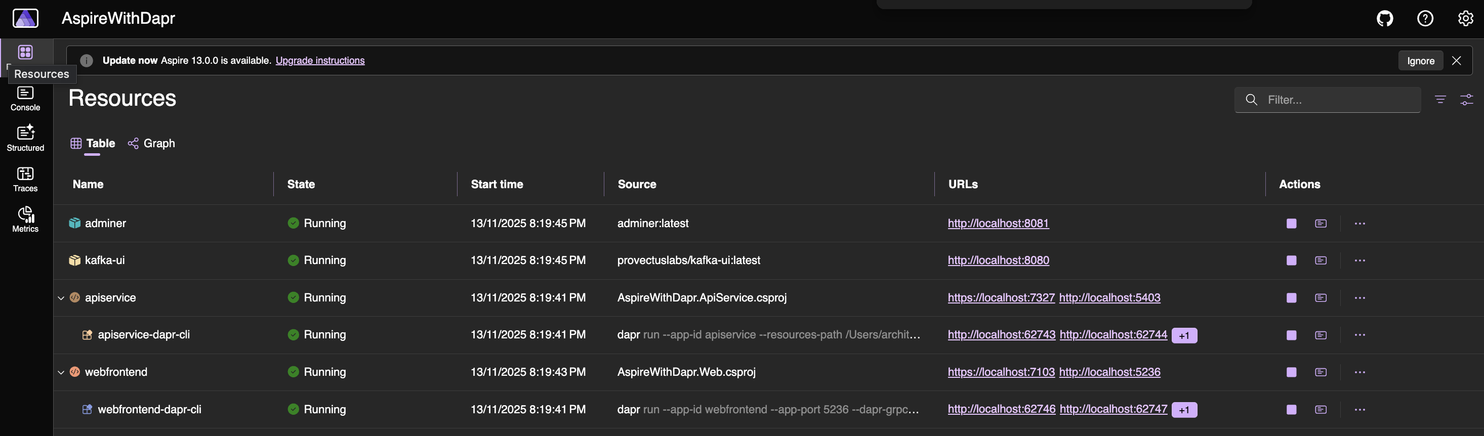 Upon successful completion, you can access the Aspire Dashboard by clicking the URL in the host section of the terminal window. The dashboard will list two additional resources apiservice-dapr-cli and webfrontend-dapr-cli which represent the Dapr sidecars, along with Adminer to analyze stored data in MySQL.