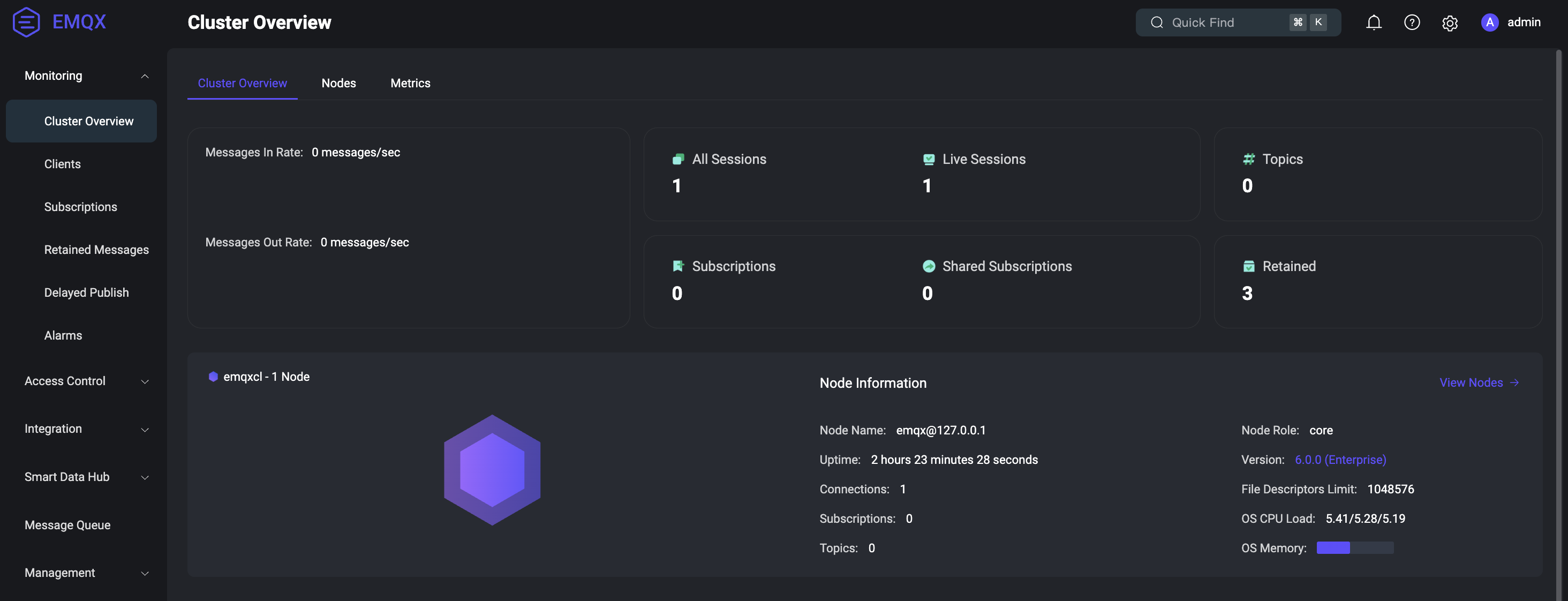 To access the EMQX UI, refer to the Docker Compose file, which includes the port mapping for the EMQX dashboard (e.g., 18083:18083) as well as the username and password. You should see the login screen and dashboard similar to the examples shown below.