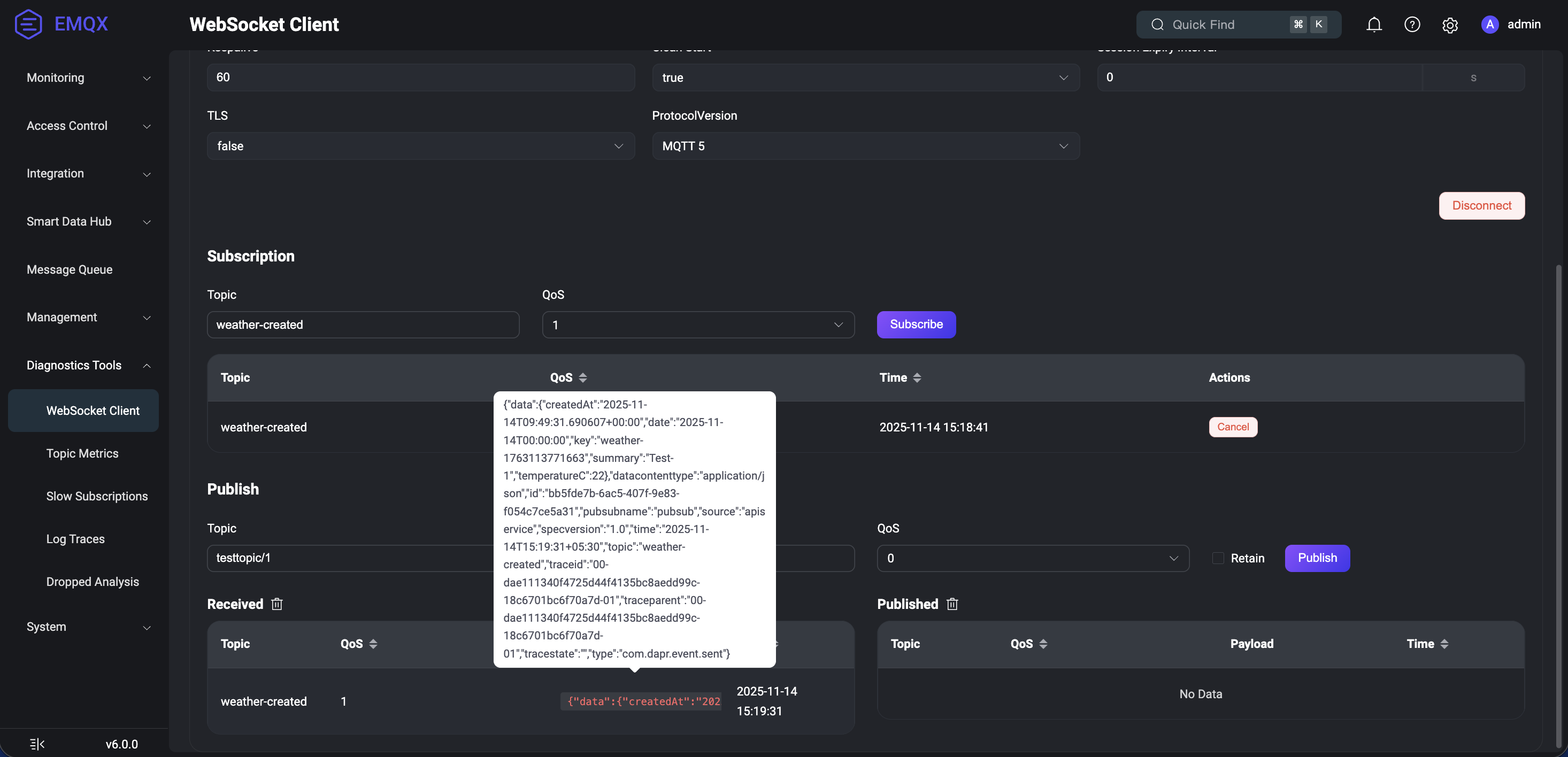 Once you reach the dashboard, navigate to Diagnostic Tools and select WebSocket. Then click the Connect button. After the connection is established, subscribe to the weather-created topic by clicking the Subscribe button. Once subscribed, you should start seeing the messages being captured. Refer to the screenshot below.