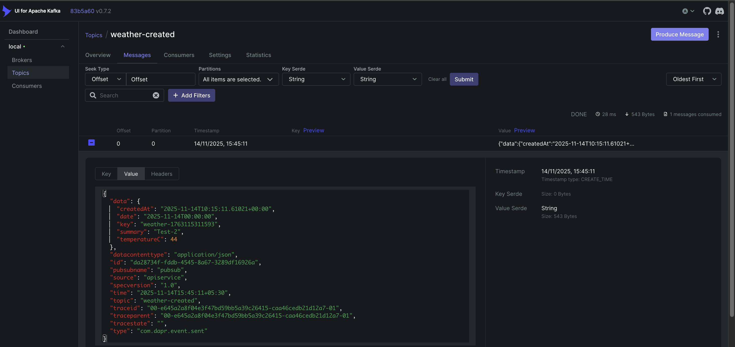 I created another test entry after reseting statestore and configuring Kafka as pub/sub broker, and here is the result. Let’s verify it using the Kafka UI.