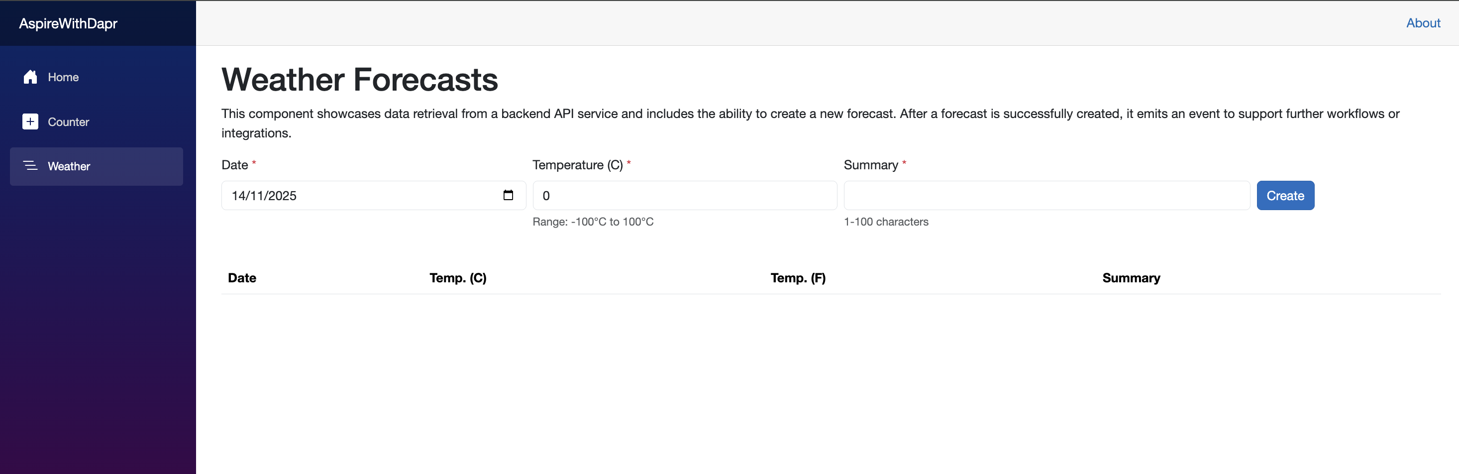 From there, open the web frontend application and click the Weather menu to access the option for creating a new forecast. Let’s create a few forecasts and then view the data in the state store and the pub/sub broker.
