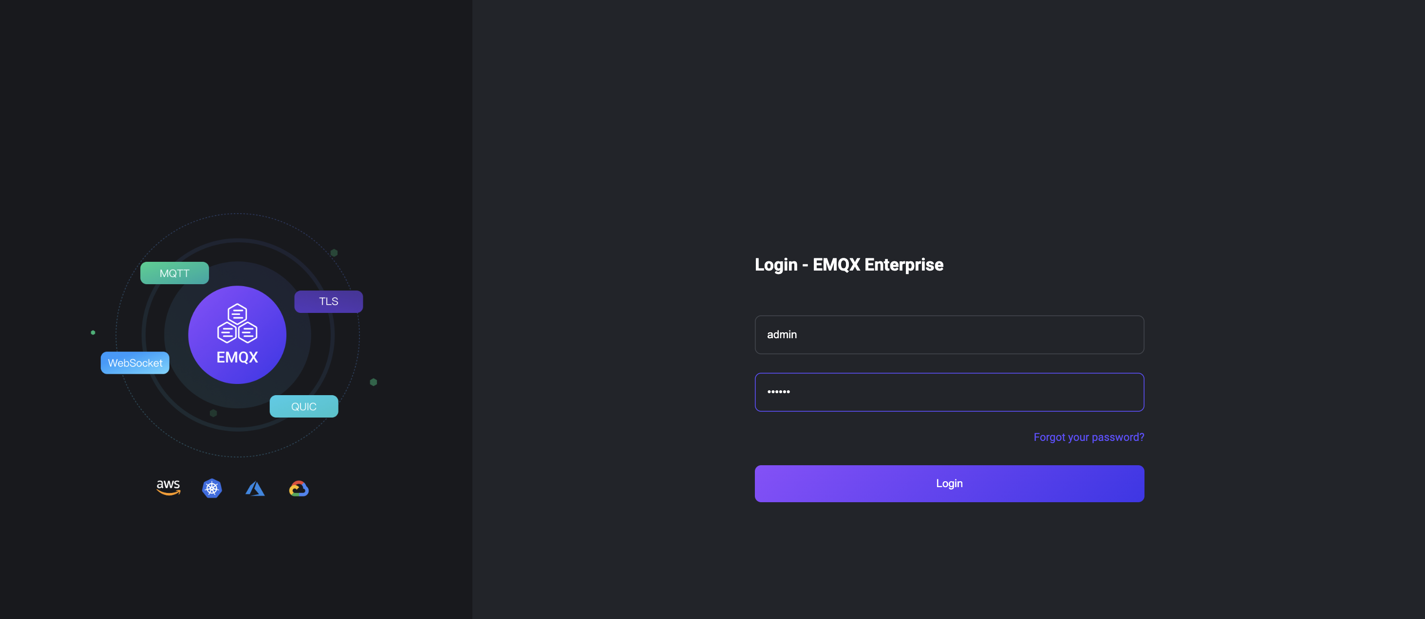 To access the EMQX UI, refer to the Docker Compose file, which includes the port mapping for the EMQX dashboard (e.g., 18083:18083) as well as the username and password. You should see the login screen and dashboard similar to the examples shown below.