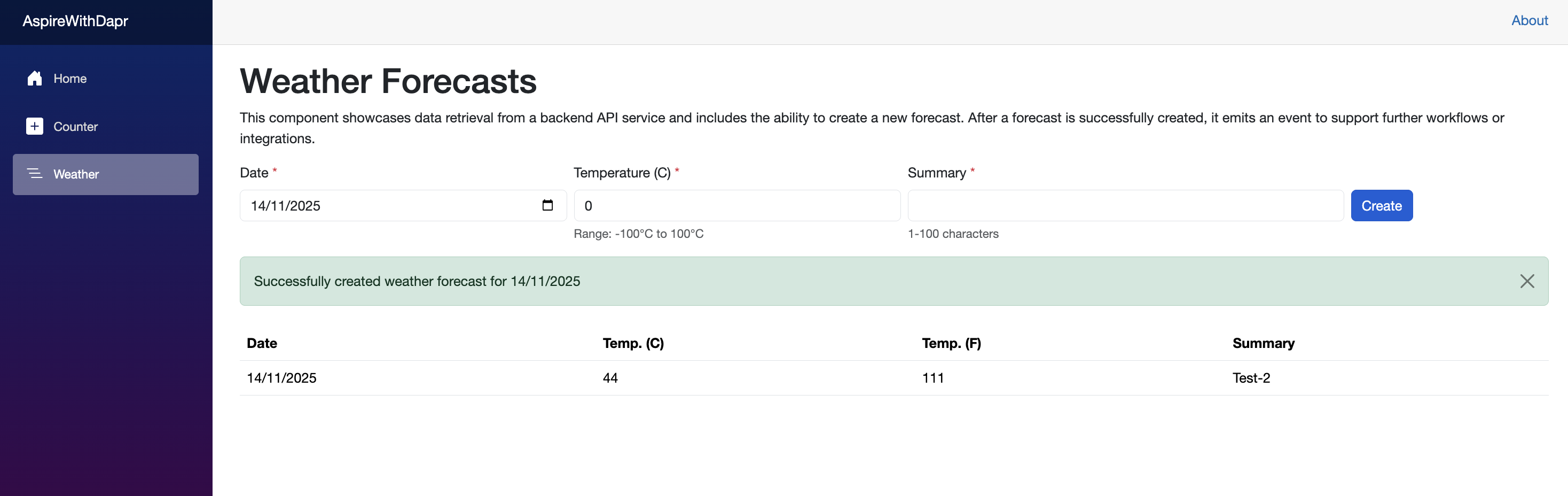 From there, open the web frontend application and click the Weather menu to access the option for creating a new forecast. Let’s create a few forecasts and then view the data in the state store and the pub/sub broker.