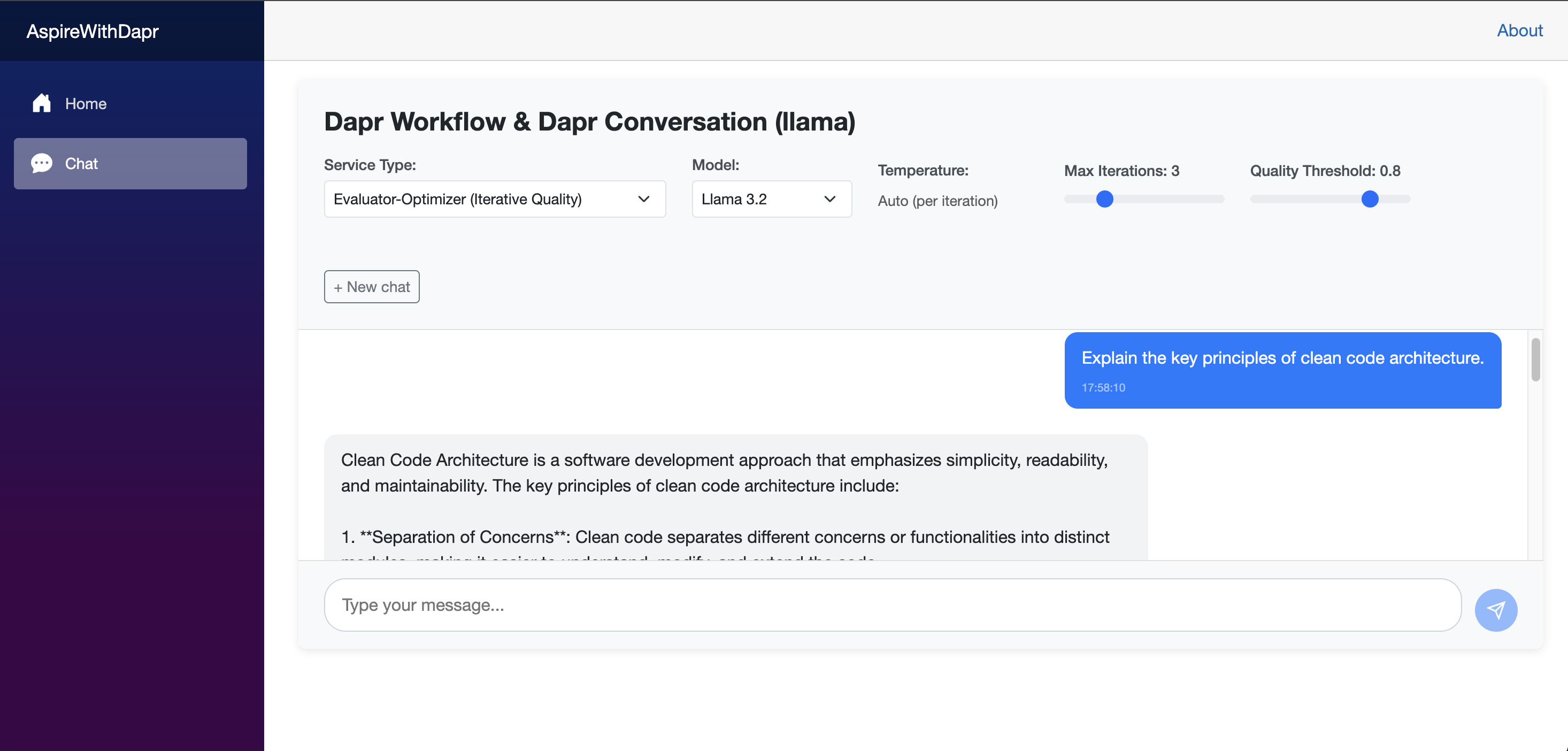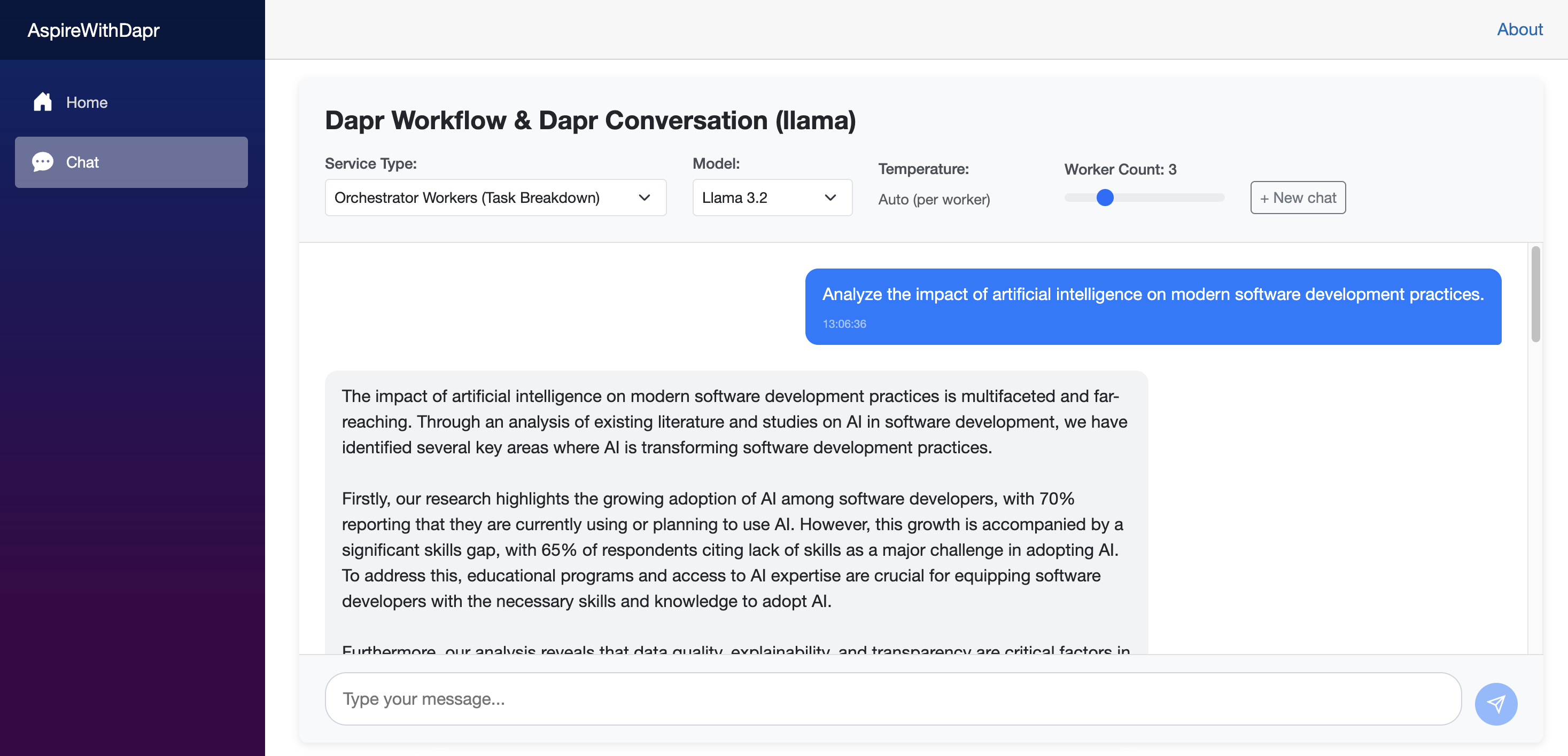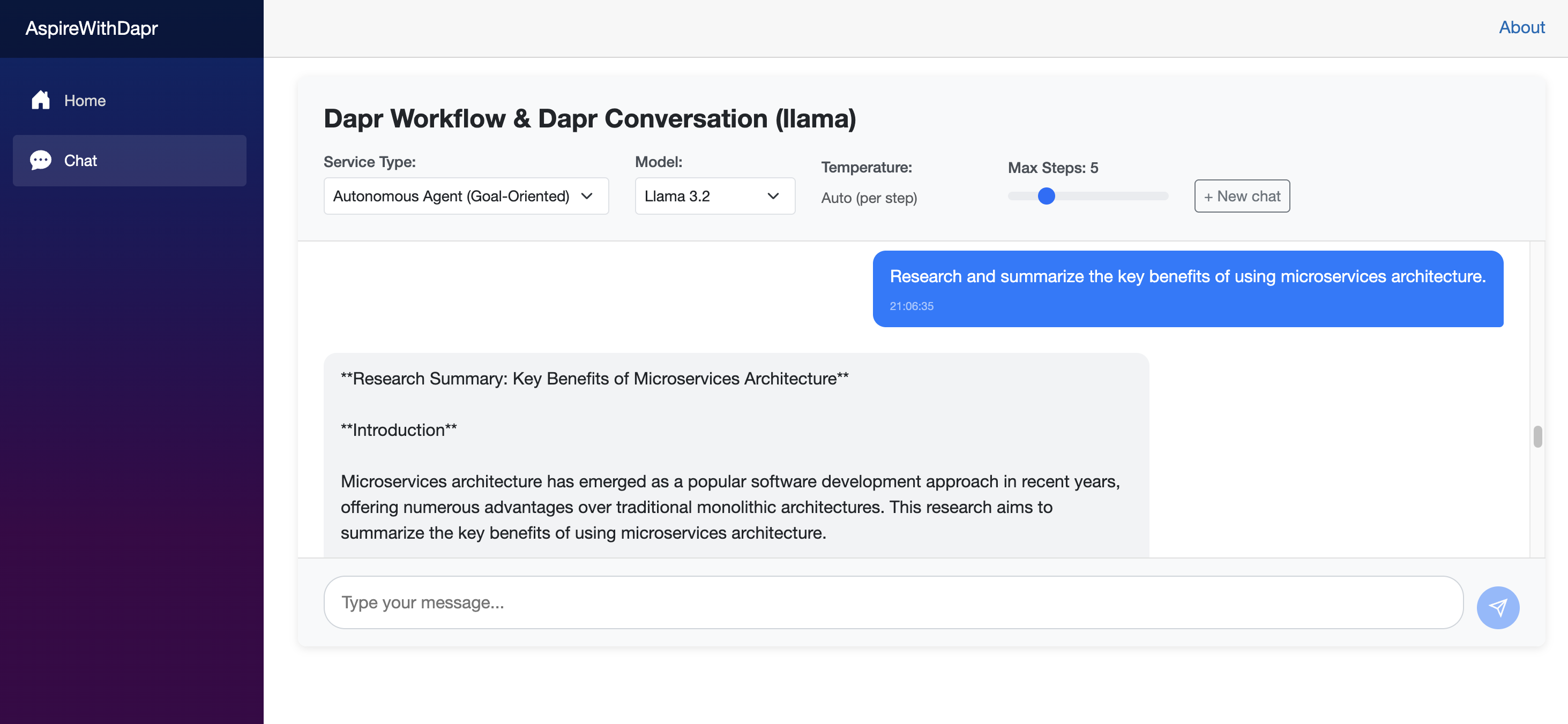 Run the web application from the Aspire Dashboard. Once it launches, select Autonomous Agent (Goal Oriented) as the service type. You can then start a conversation and observe the application’s behavior. Using the Diagrid Dashboard, you can inspect the underlying workflow state and review historical execution data.
