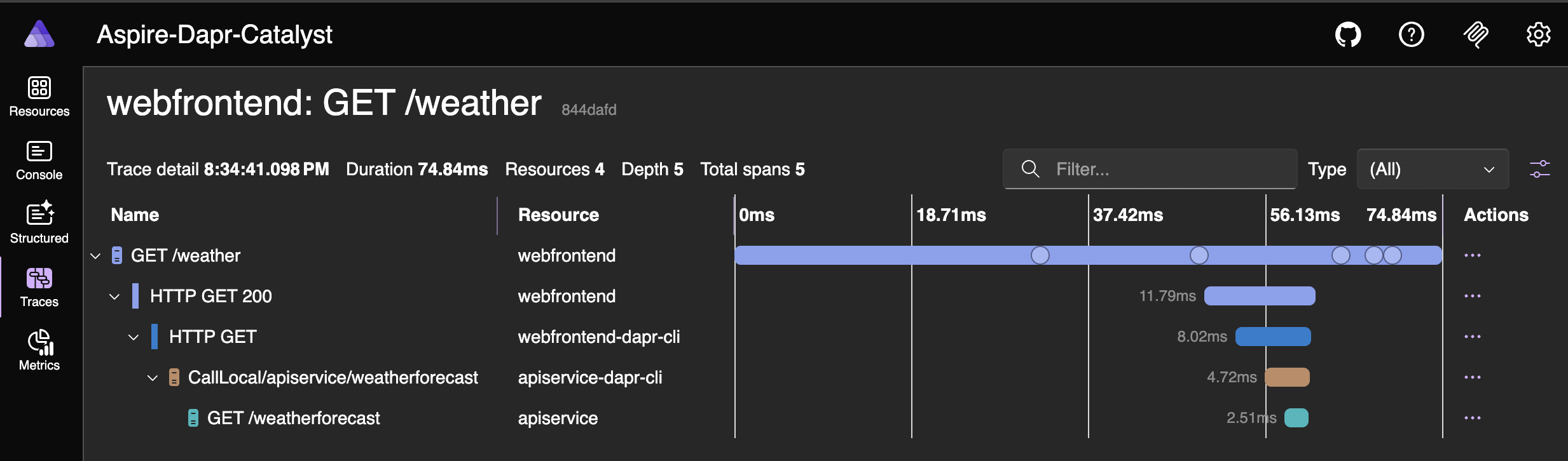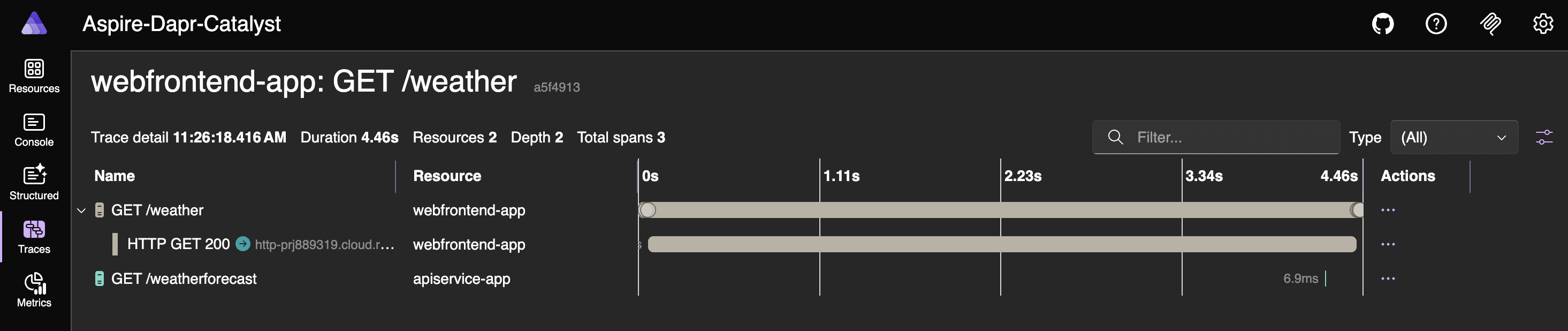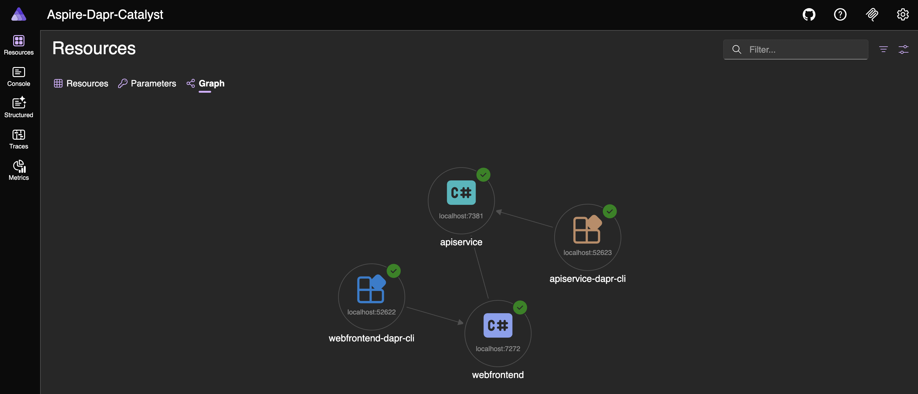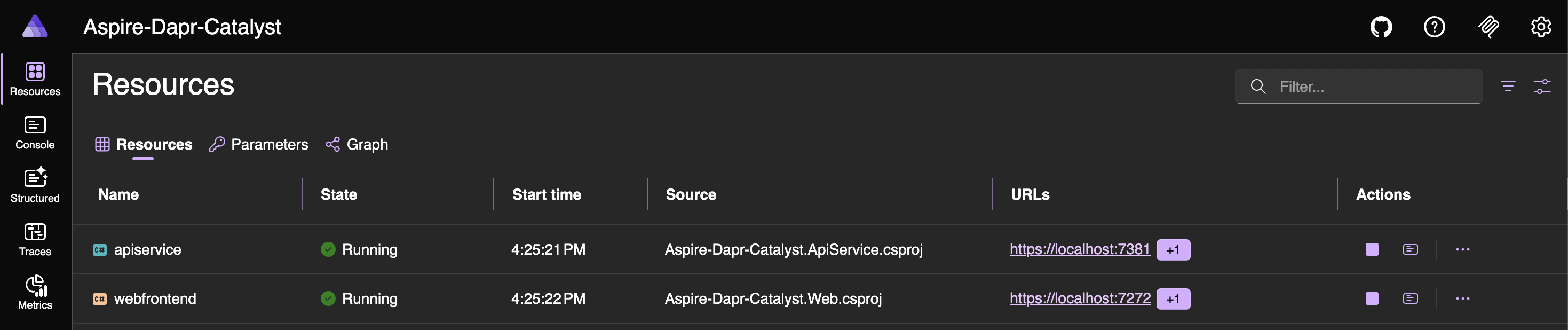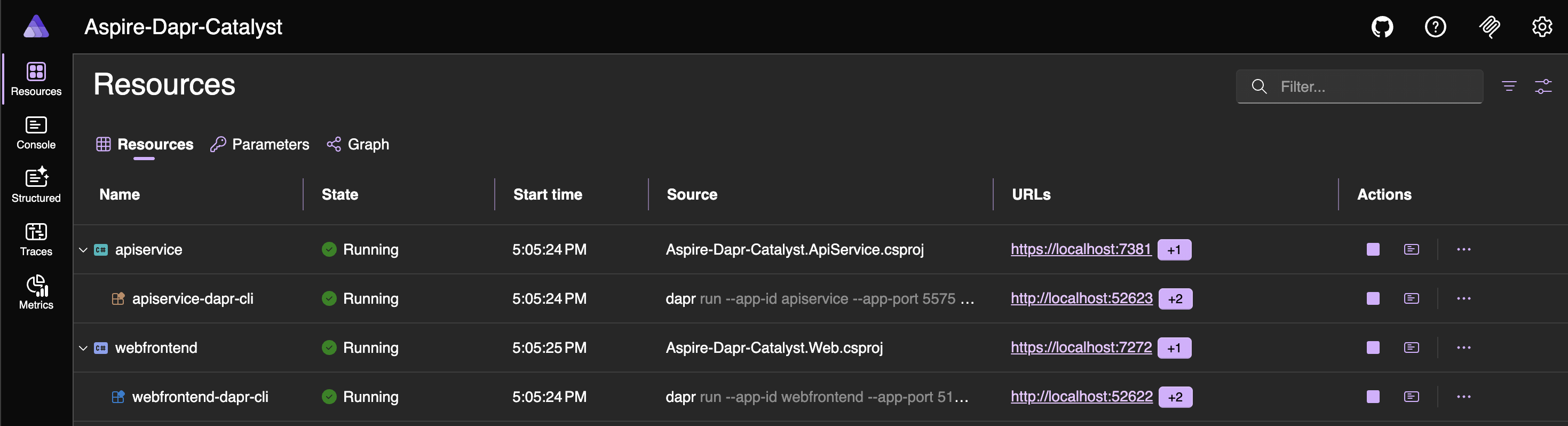 aspire runWhen the app starts, open the dashboard using the URL shown in the host section of the terminal window. You will see two additional resources: apiservice-dapr-cli and webfrontend-dapr-cli, which correspond to the Dapr sidecars.