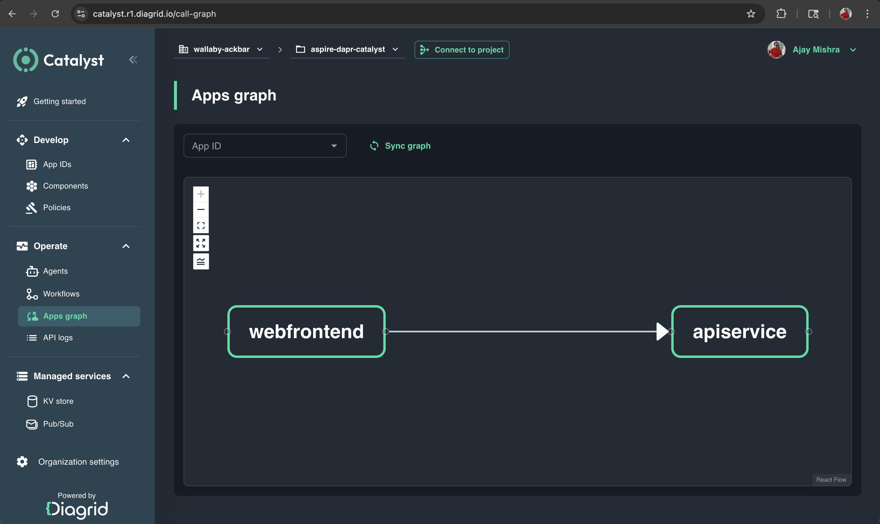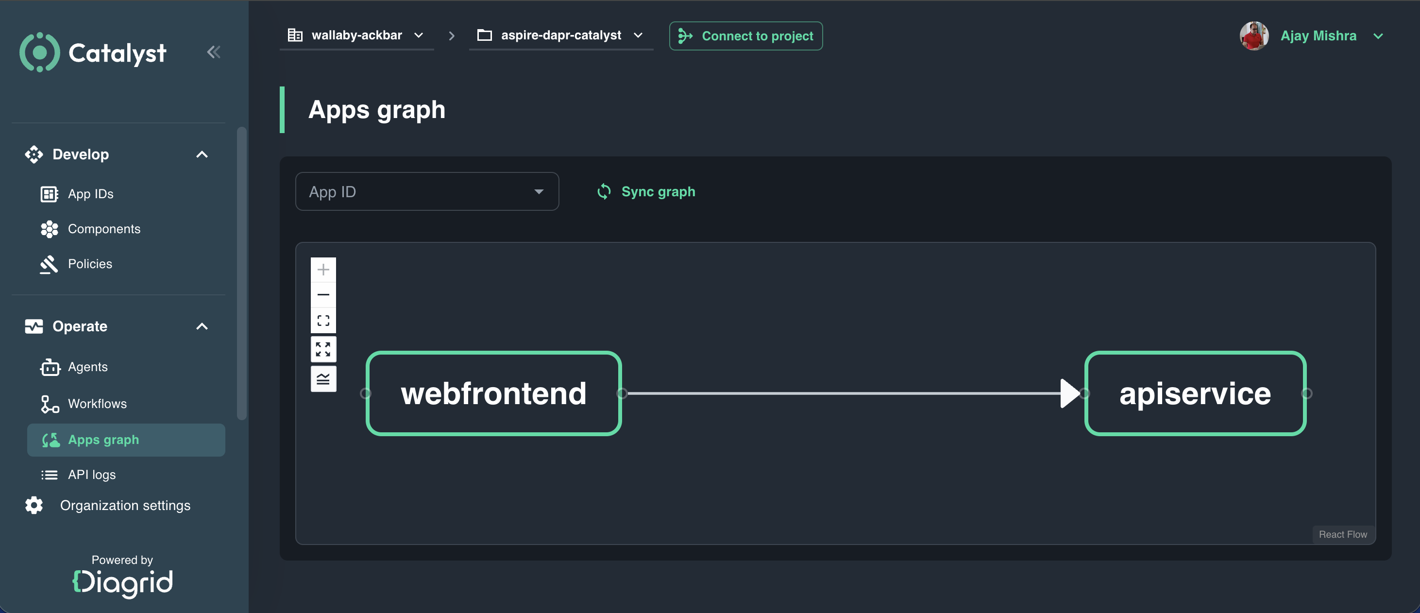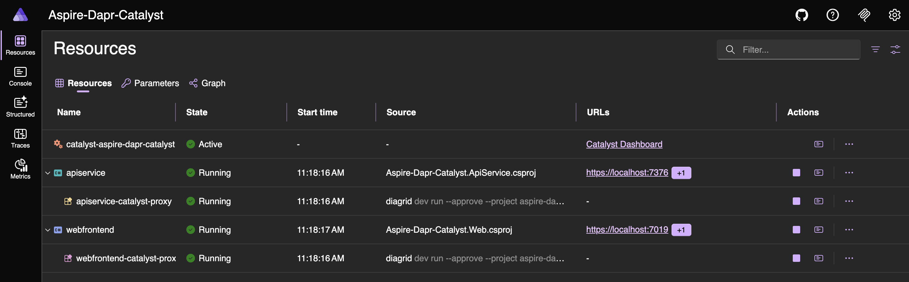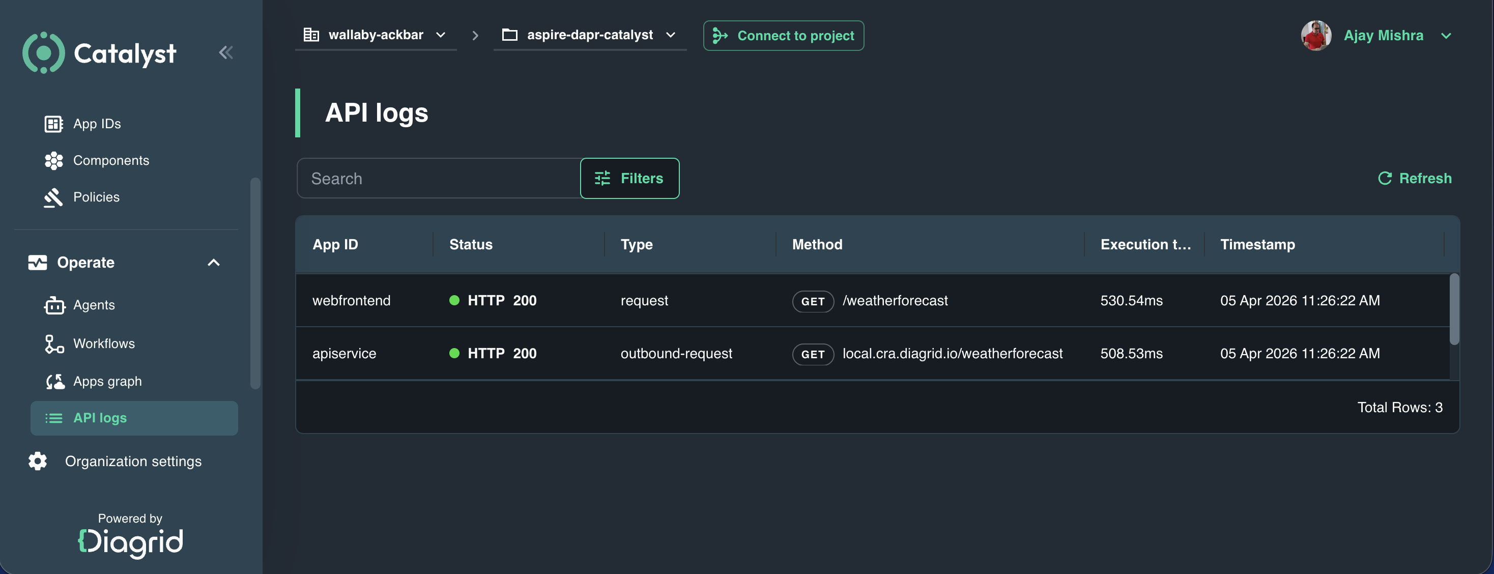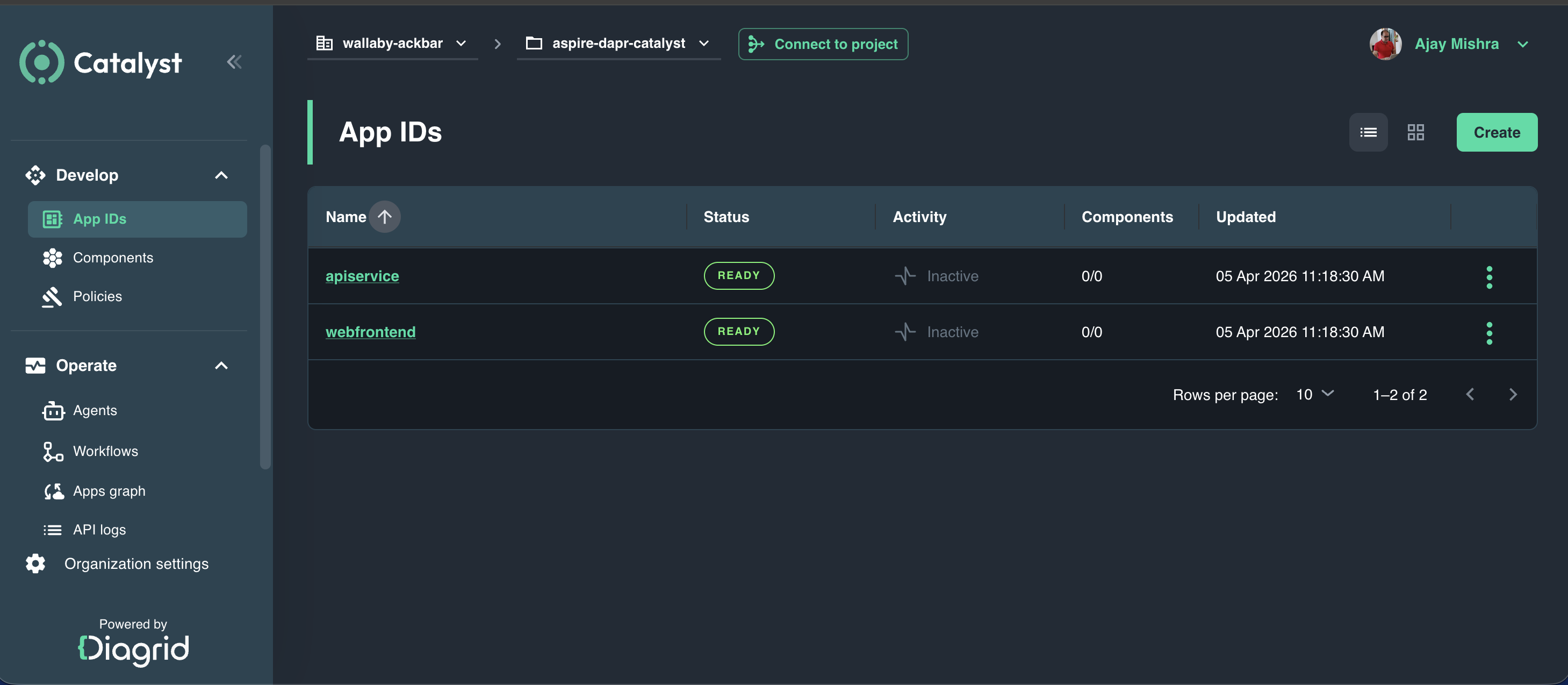 diagrid dev run --app-id apiservice --app-port 8082 --project aspire-dapr-catalyst --approveWhat these commands do: