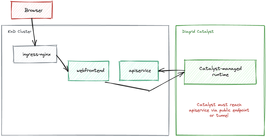 diagridcommand tells Catalyst to route App IDapiservicetraffic to that local port - Together, they form the local KinD-to-Catalyst bridge for inbound calls to