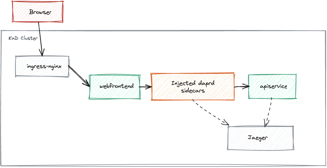This shows KinD workloads with cluster-side Dapr injection, as illustrated in the diagram below.