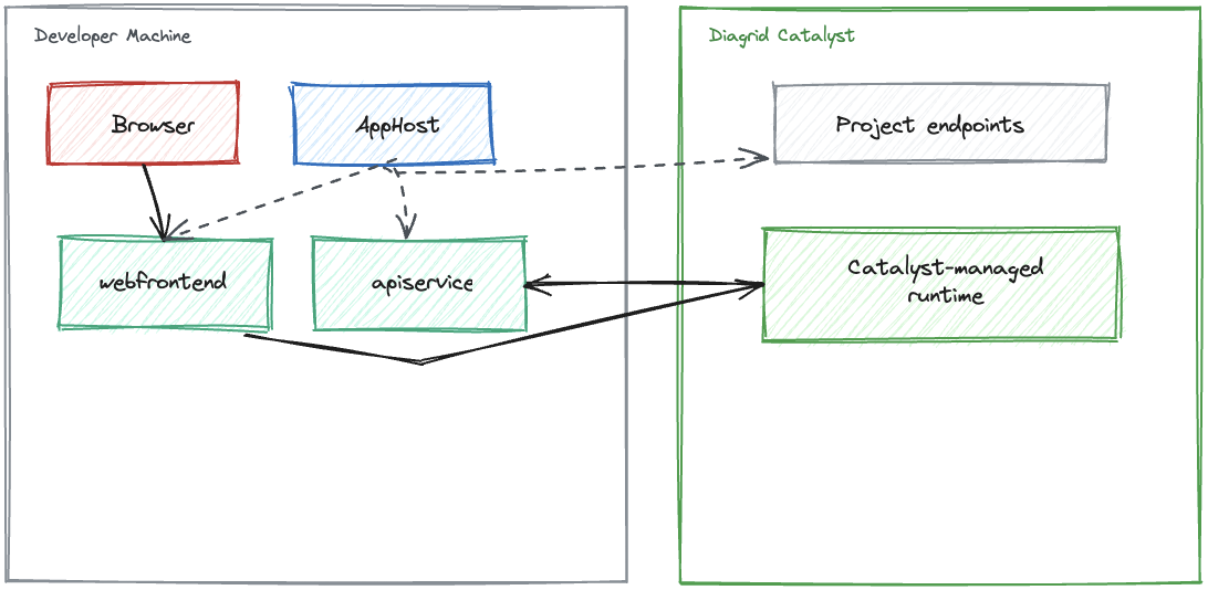 This blog post demonstrates how to use Diagrid Catalyst, which manages Dapr sidecars and the control plane, enabling you to focus on building distributed applications. In other words, Diagrid Catalyst is Dapr offered as a managed service that removes infrastructure complexity and provides built-in observability, security, and developer-friendly APIs for distributed systems. To learn more, you can visit the Diagrid Catalyst.
