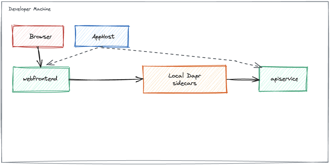 This shows local applications with local Dapr sidecars, as illustrated in the diagram below.