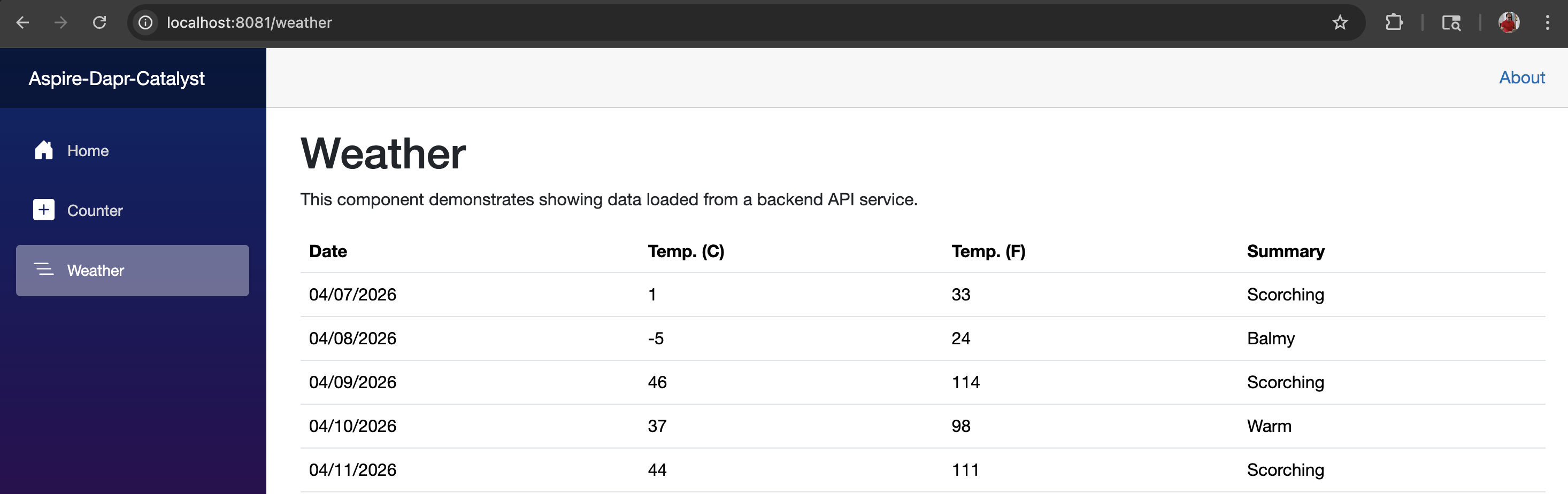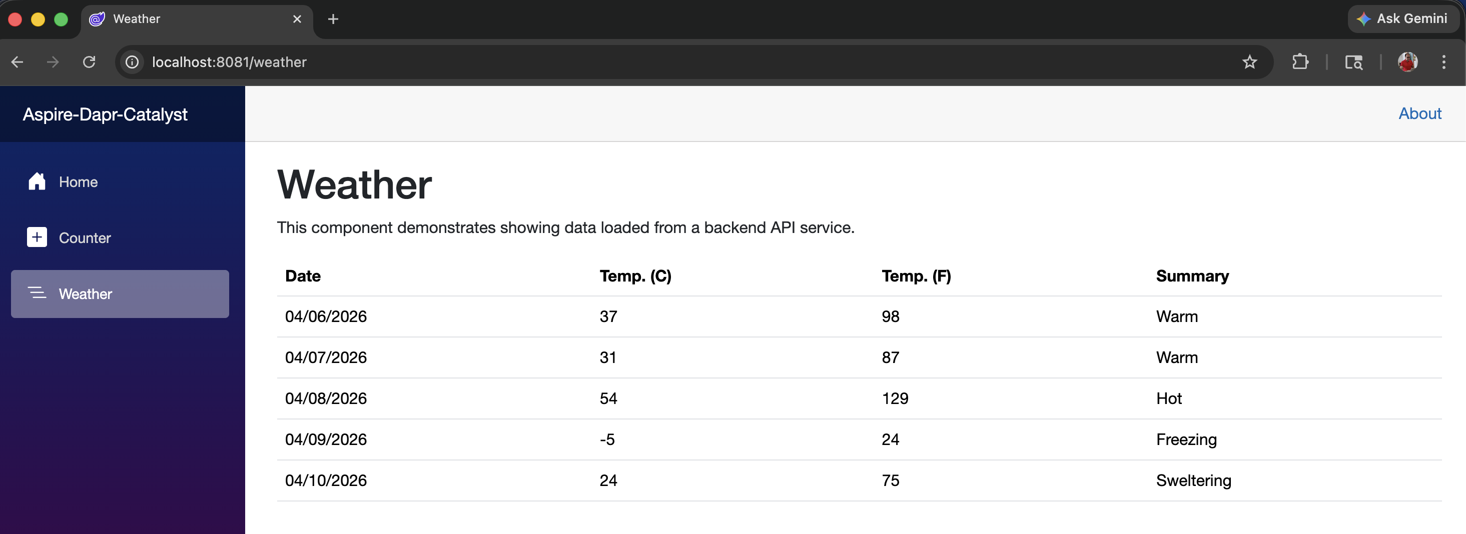 The demo app is based on the Aspire starter template, which includes a frontend (ASP.NET Core Blazor App), a backend (ASP.NET Core Minimal API), Service Defaults, and an AppHost project to demonstrate Aspire's capabilities.